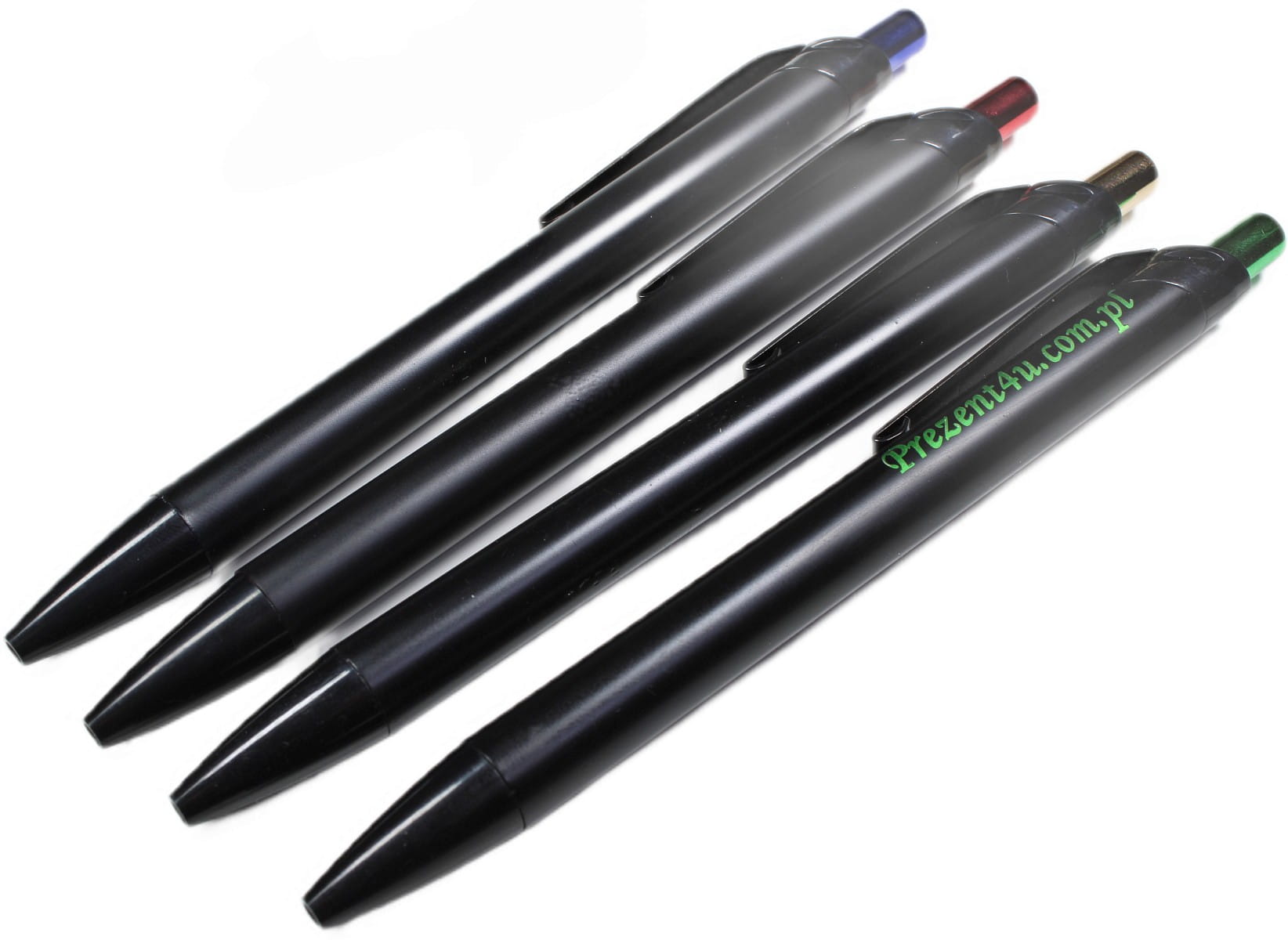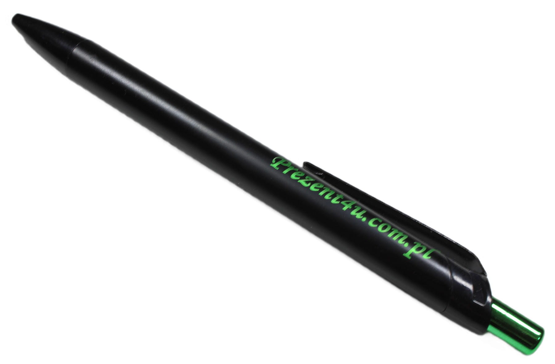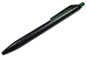 Metalowy czarny długopis PRESA z metalowym zielonym przyciskiem. Niekonwencjonalny w tym długopisie laser o zielonym połysku. Szczególnie wyróżnia się tutaj odwrotne przetwarzanie logo. Wkład w kolorze niebieskim.